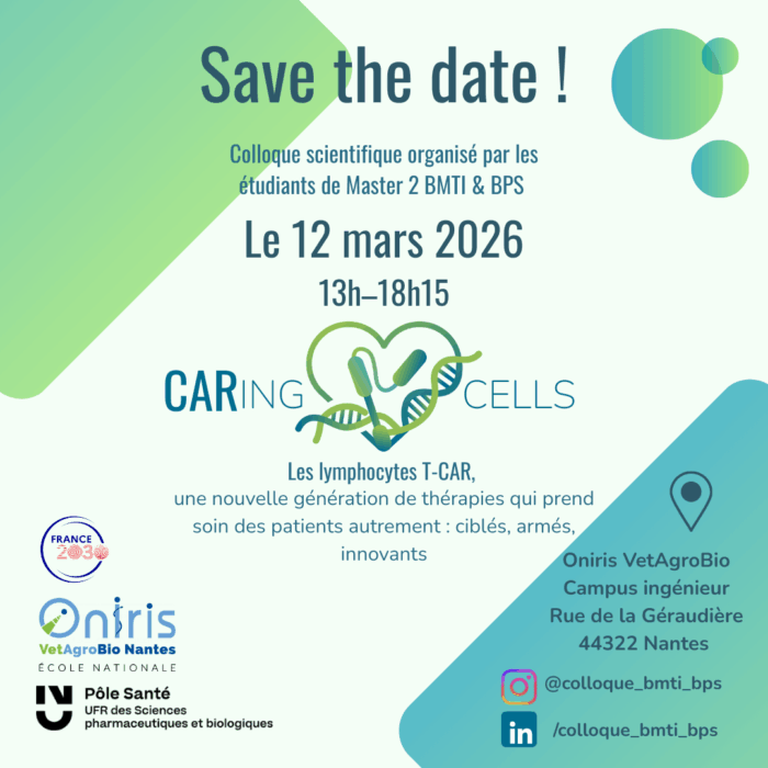 Atlanpole Biotherapies soutient le colloque scientifique consacré aux thérapies par lymphocytes T-CAR (CAR-T Cells), organisé par les étudiants des Masters 2 BMTI (Biomédicaments de Thérapies Innovantes) et BPS (Bioproduction Santé) de la Faculté de Pharmacie de Nantes et d’Oniris.