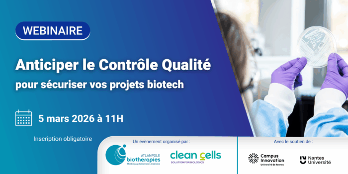 Atlanpole Biotherapies a le plaisir de vous inviter à un webinaire sur le sujet « Anticiper le Contrôle Qualité pour sécuriser vos projets biotech » le jeudi 5 mars 2026 de 11h00 à 12h00.